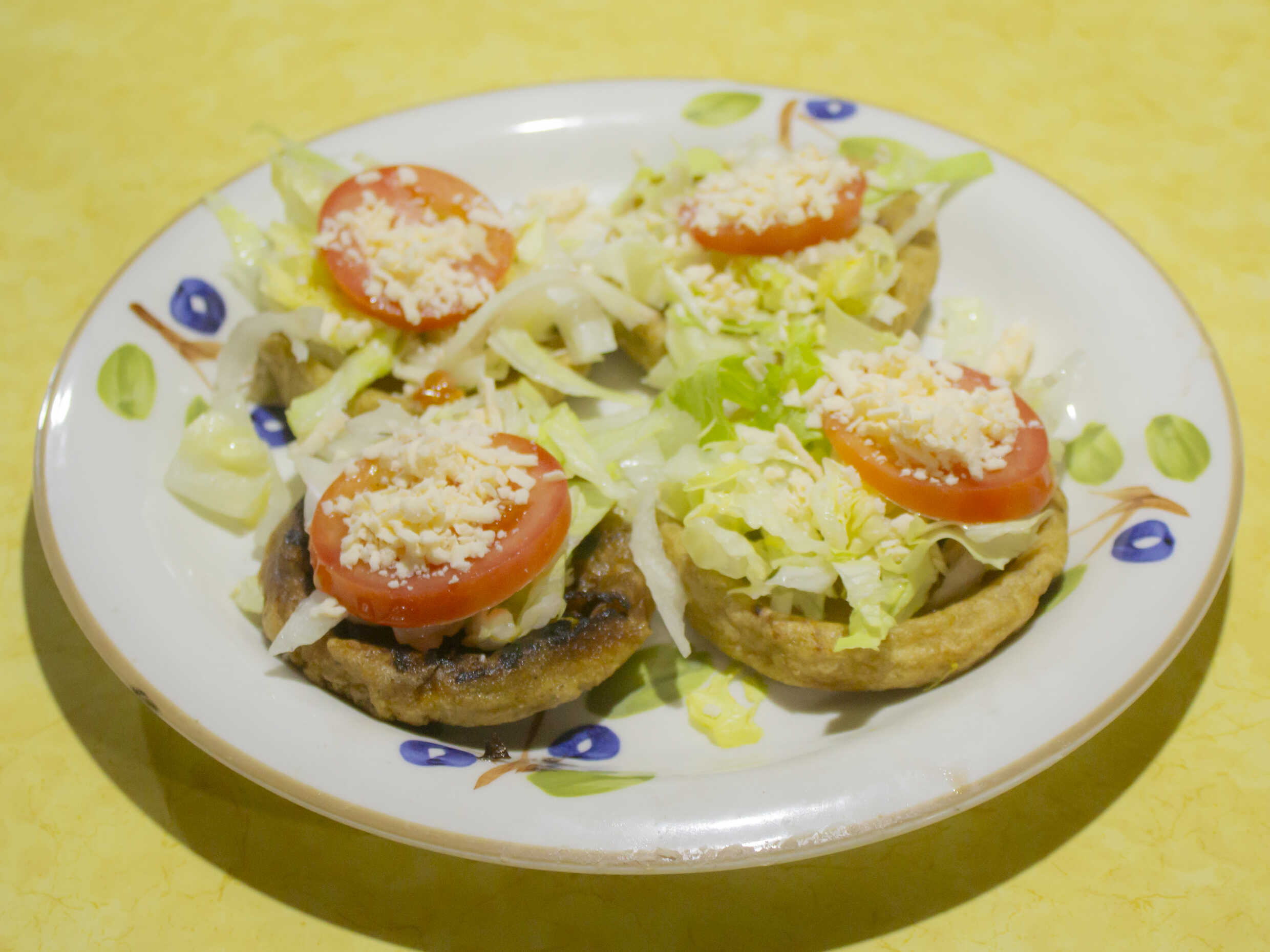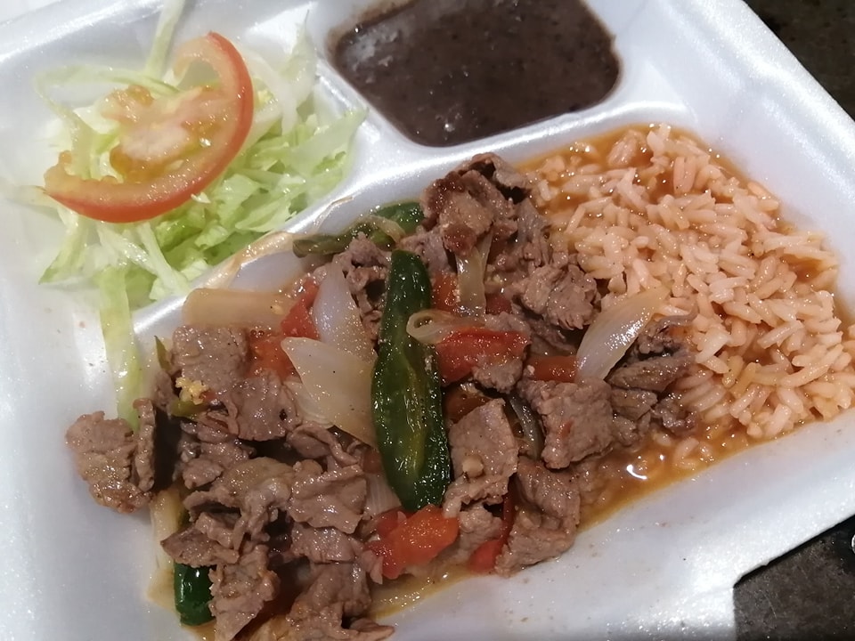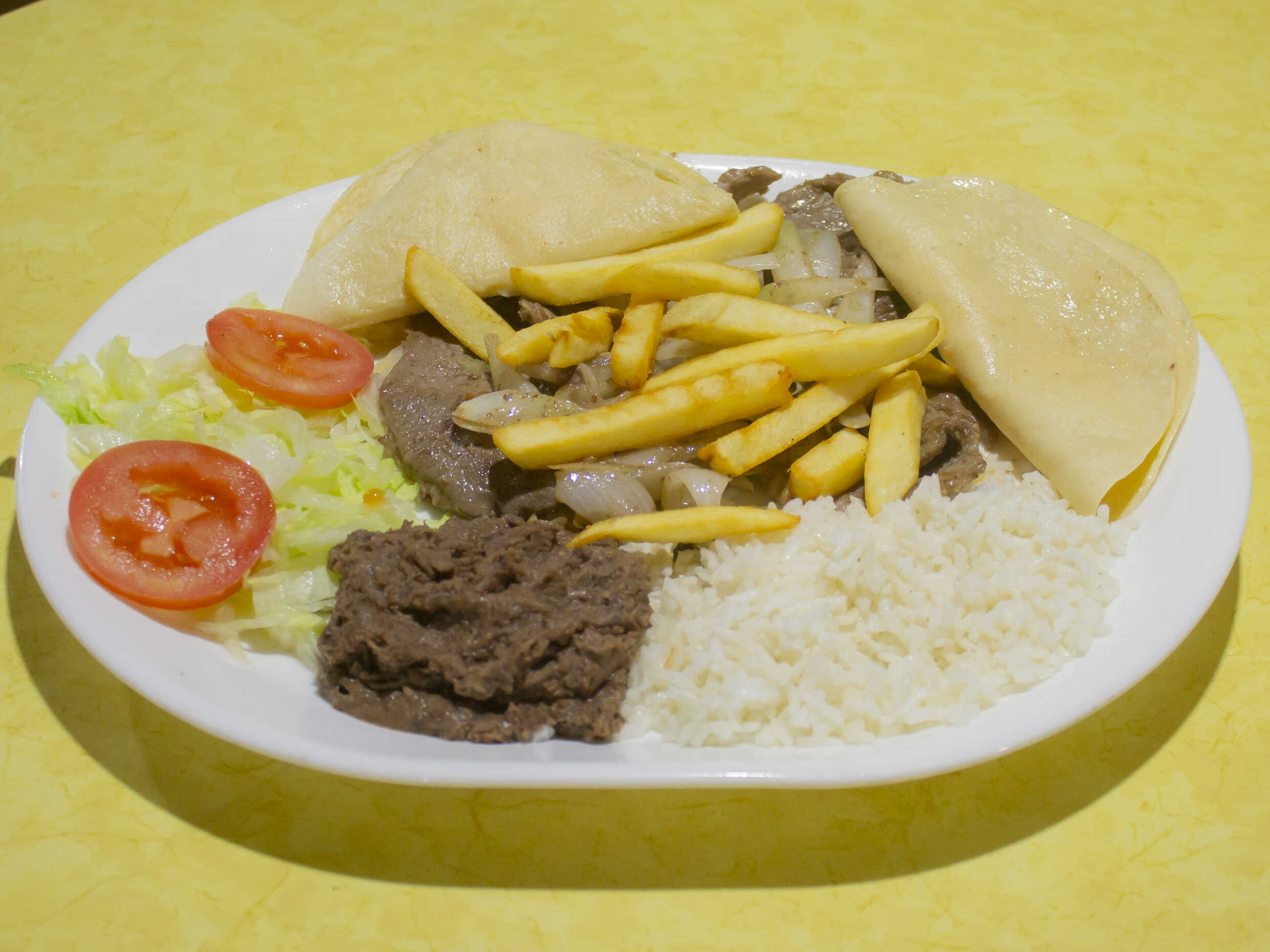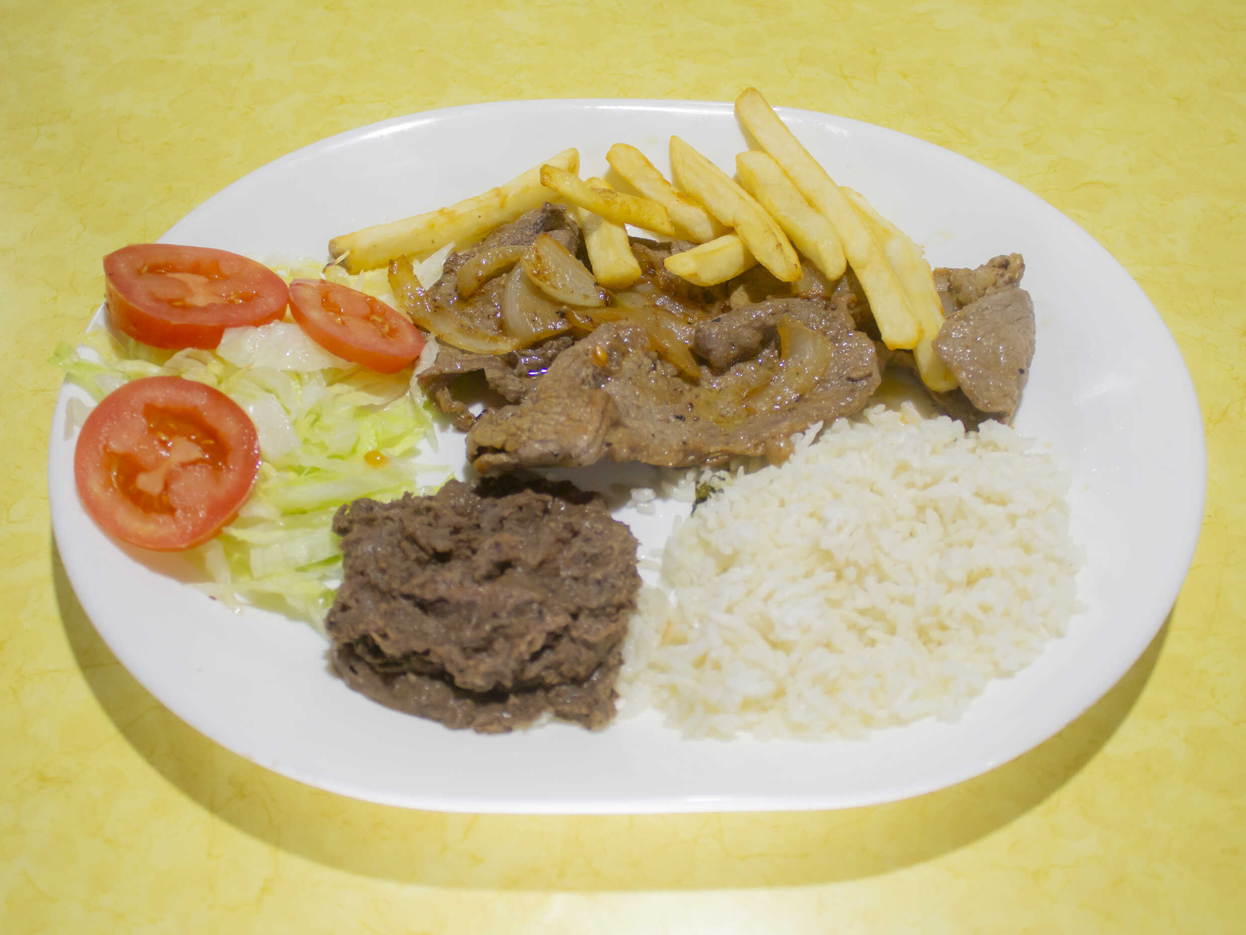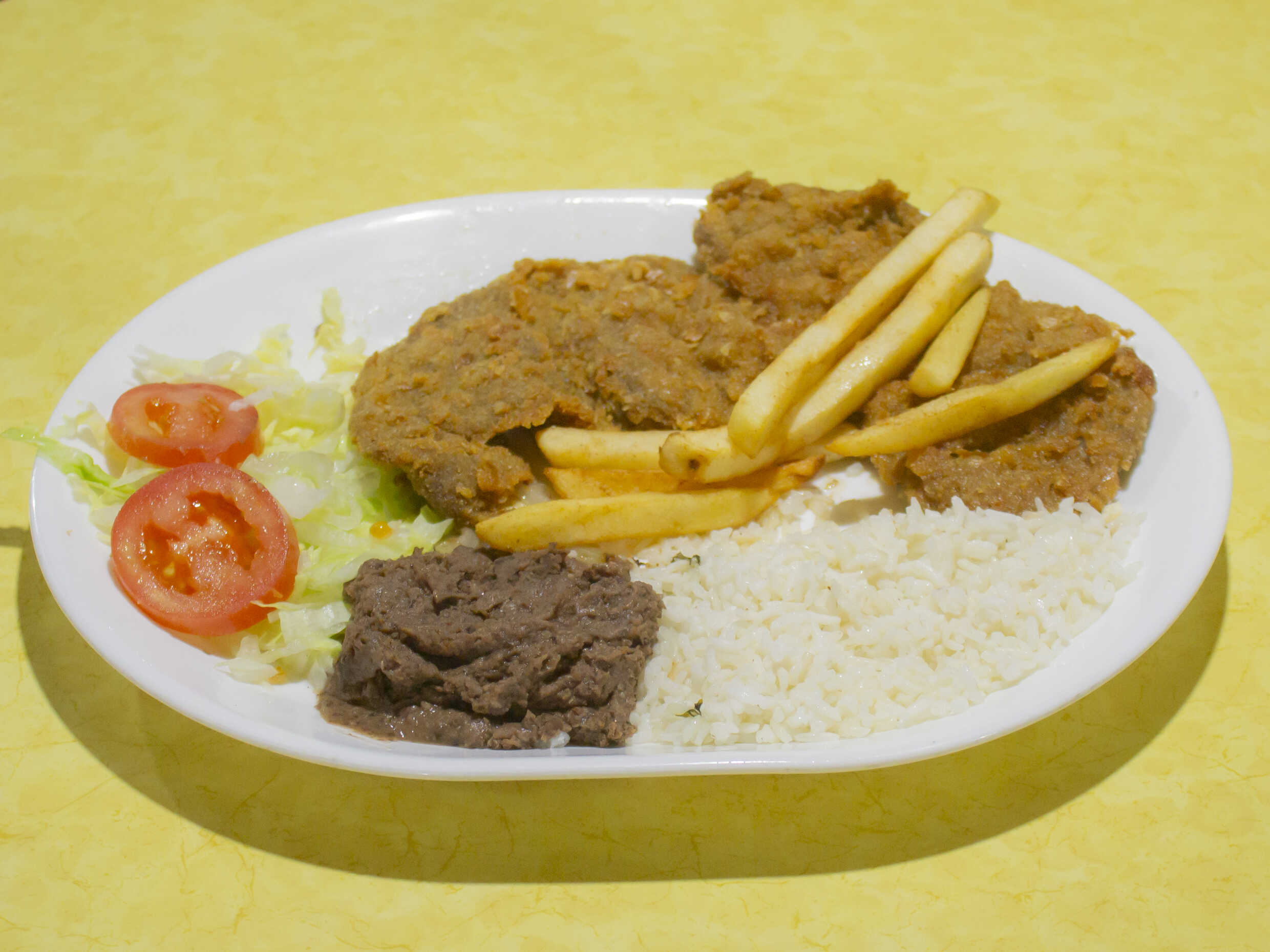 Acompañado de arroz, frijoles, verdura, papas fritas y dos quesadillas.