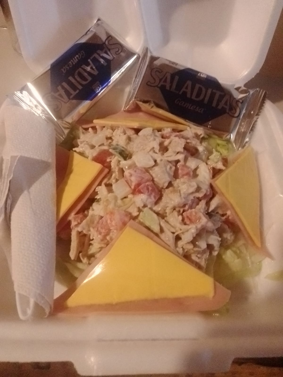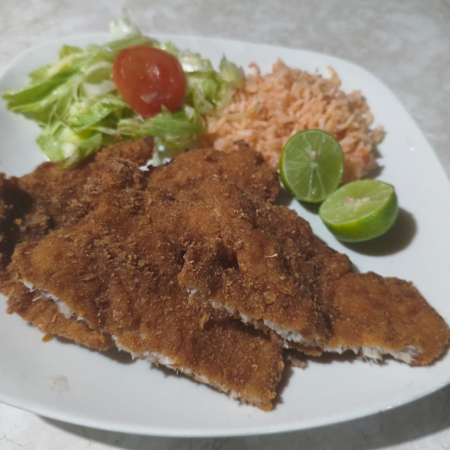 filete de pescado empanizado acompañado de arroz, ensalada y tortillas.
