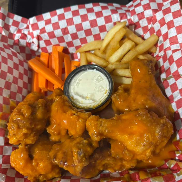 700gr De Alitas (10pzas) Bañadas En Salsa De Su Preferencia Acompañadas De 250gr De Papas A La Francesa Y 2 Aderezos De 2onz