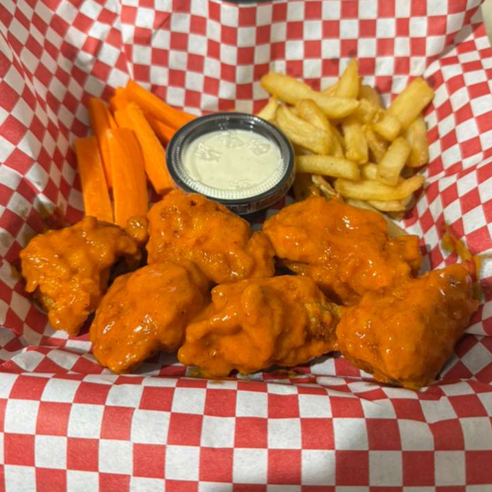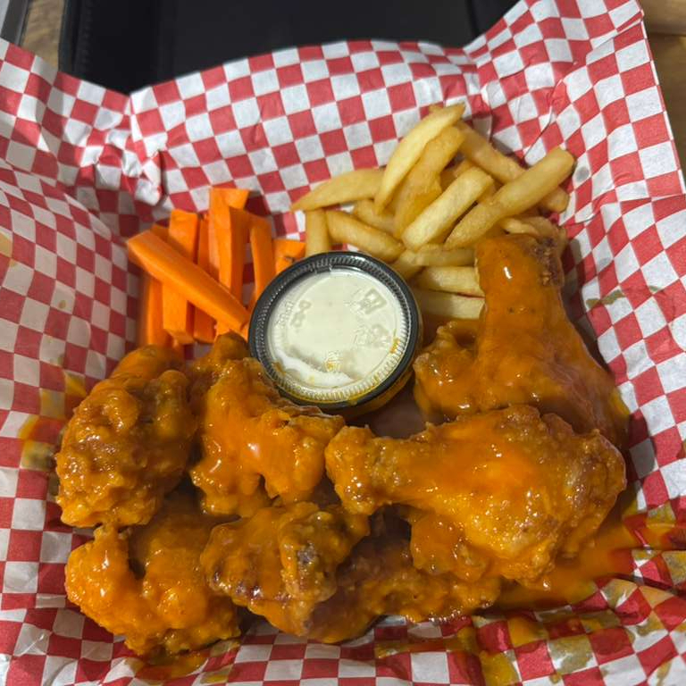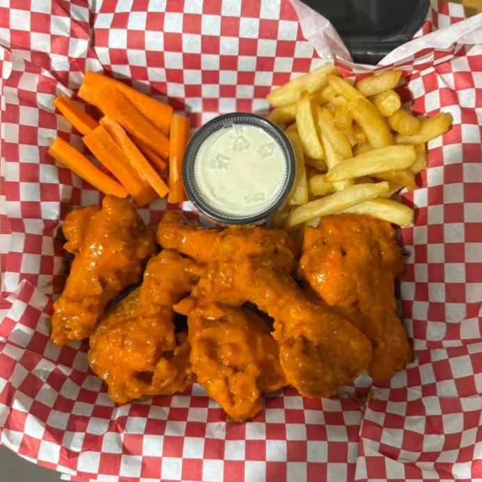 420 Gramos De Alitas (6pzas) Bañadas En Salsa De Su Preferencia Acompañado De 250gr De Papas A La Francesa Y 1 Aderezo De 2onz