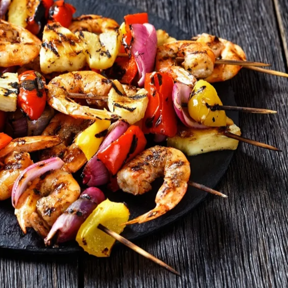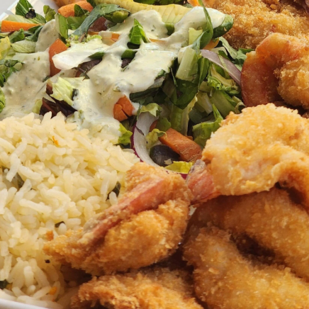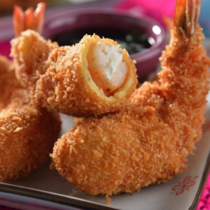 Camarones empanizados enrollados con tocino rellenos de philadelphia. acompañados de arroz, ensalada y papas a la francesa