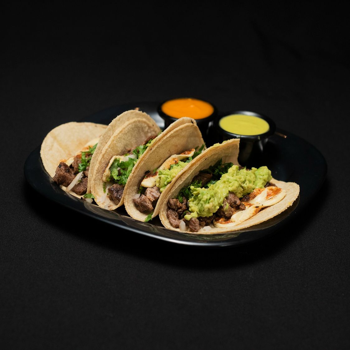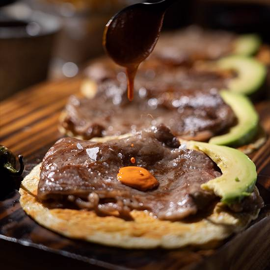 4 pz de tacos carne de Rib-Eye, costra de queso y aguacate.