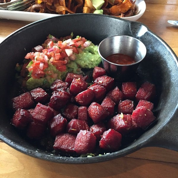 Fajita complementada con guacamole, choriqueso y cebolla asada.