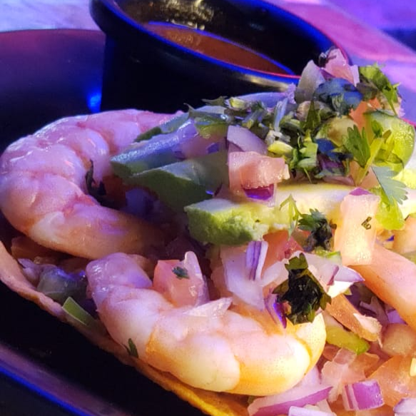 2 Tacos de camarón, 2 tacos de chicharrón de pescado y 1 tostada de camarón.