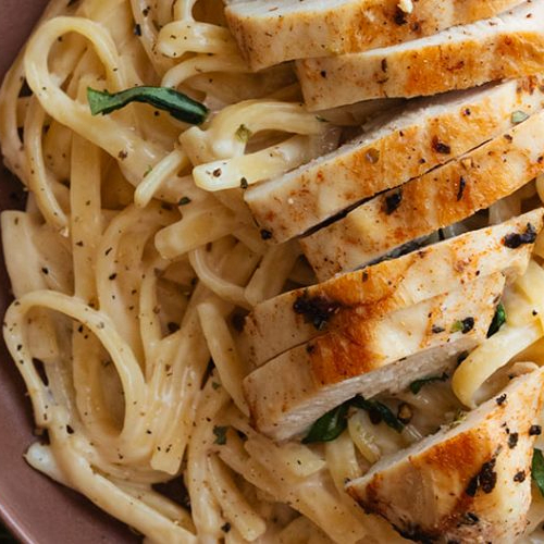 Pasta Alfredo en salsa chipotle y pechuga de pollo acompañada con un pan con ajo