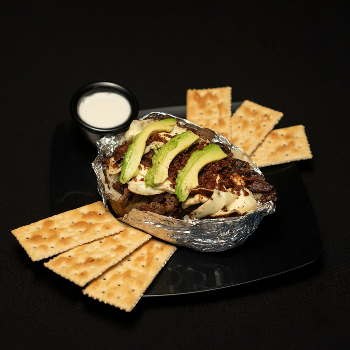 Papa con mantequilla, acompañada con fajita, jamón, queso gratinado, aguacate y tocino.