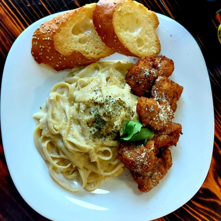 Pasta Alfredo acompañada de 4 piezas de boneless.