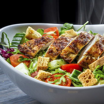 Lechuga romana bañada con aderezo Cesar’s, acompañada con pechuga a la plancha y crotones.