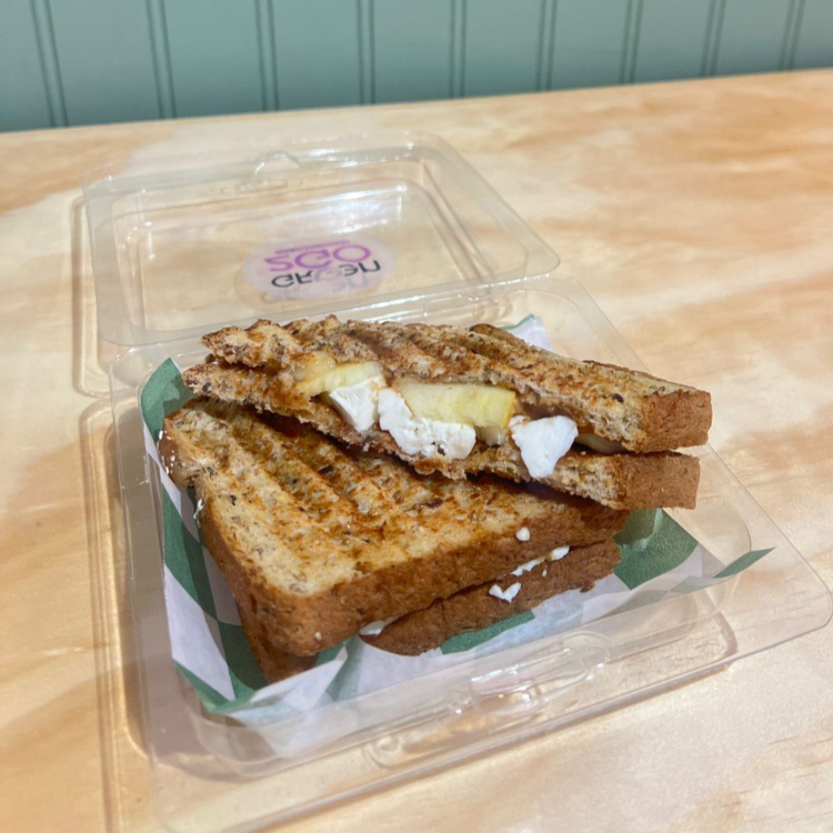 Pan integral 12 granos tostado, con rodajas de manzana, plátanos, queso panela, crema de maní y un toque de miel de abeja.