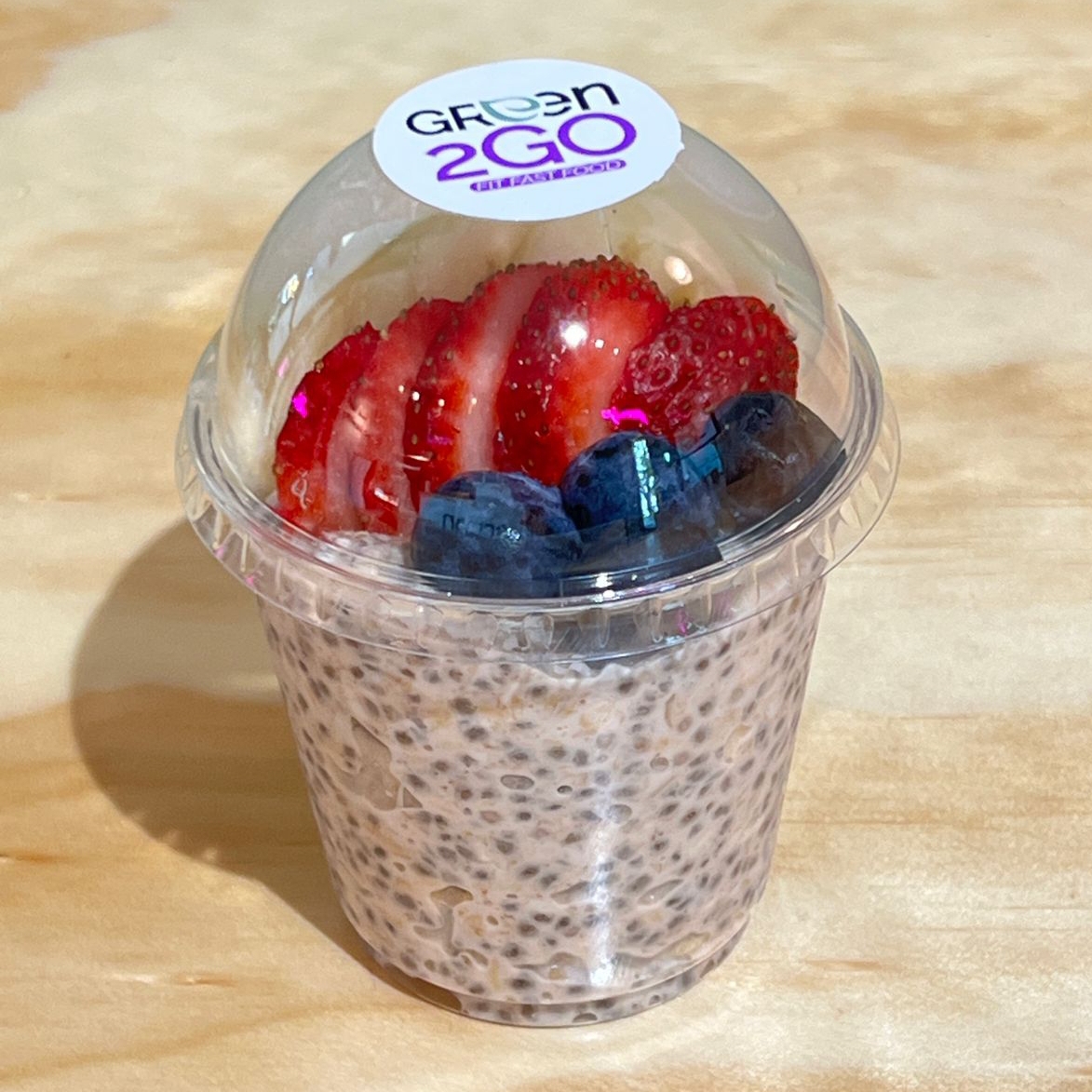 Avena con chia reposada en leche de almendras con fresa, platano, blueberries