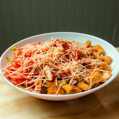 Lechuga, tomate, queso parmesano, crotones, bacon bites y pechuga de pollo.