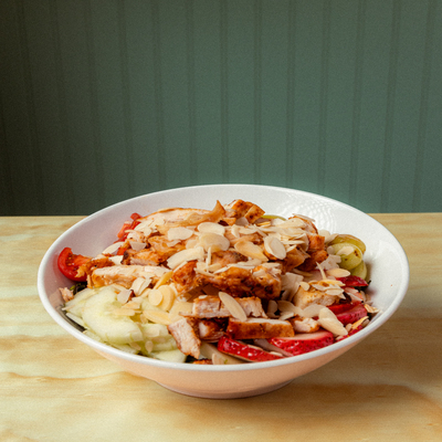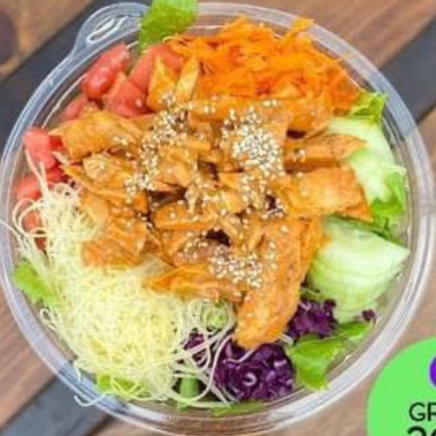 Lechuga, pepino, tomate, zanahoria, col morada, queso parmesano, pechuga de pollo buffalo y ajonjolí.