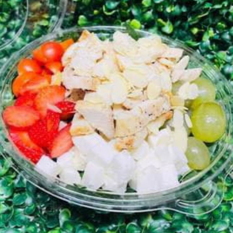 Espinacas, pepino, tomate cherry, fresas, uvas, queso panela, almendras y pechuga de pollo.
