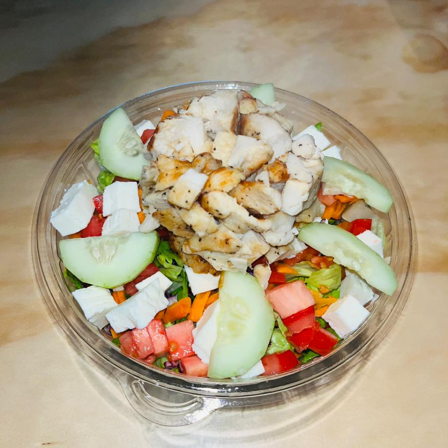Lechuga, pepino, tomate, pimiento morrón, aceitunas negras, queso de cabra, champiñones y pechuga de pollo.