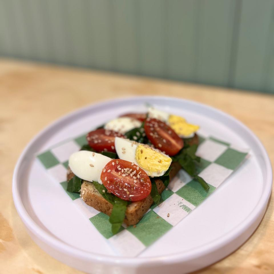 Pan integral 12 granos tostado con espinacas, aguacate, tomate cherry, vinagreta de la casa y ajonjolí.