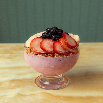 Yogurt griego, platano, fresas, blueberries y granola
