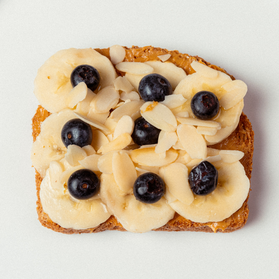 Pan Integral 12 Granos tostado, con platano, crema de mani, blueberries, amaranto, chia y miel de abeja