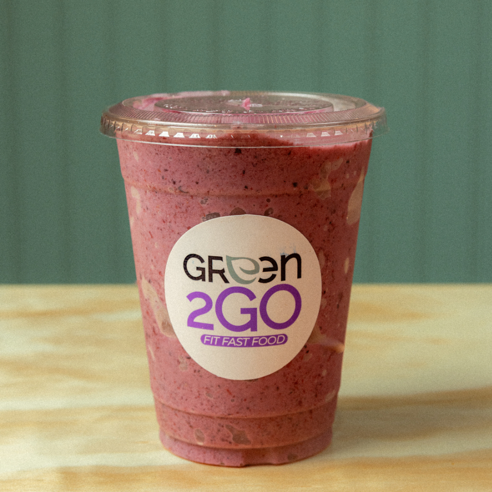 Mix de moras con yogurth griego, crema de maní y leche de almendras.