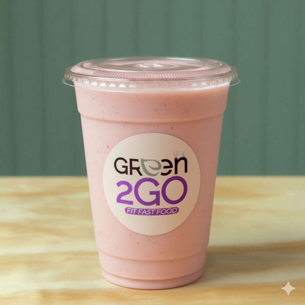 Fresa, plátano, yogurth griego y leche de almendras.