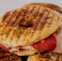 Bagel con costra de queso, bistec, queso panela, jamón y aguacate.