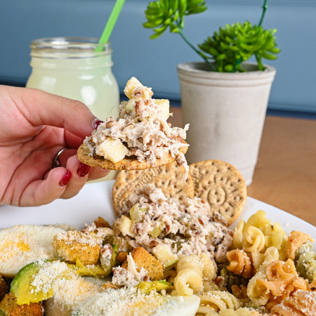 Cuernito de ensalada de pollo frutal acompañado de pasta de tornillos y jalapeños.
