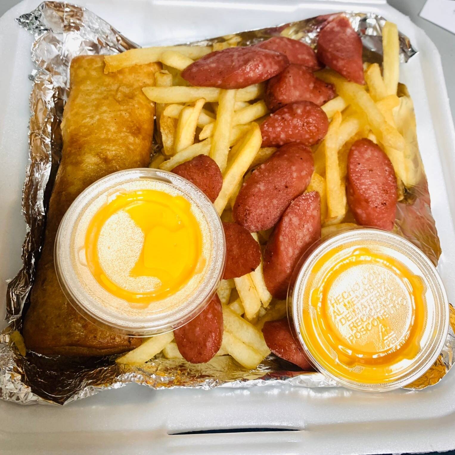 Trocitos de salchicha con papas a la francesa.