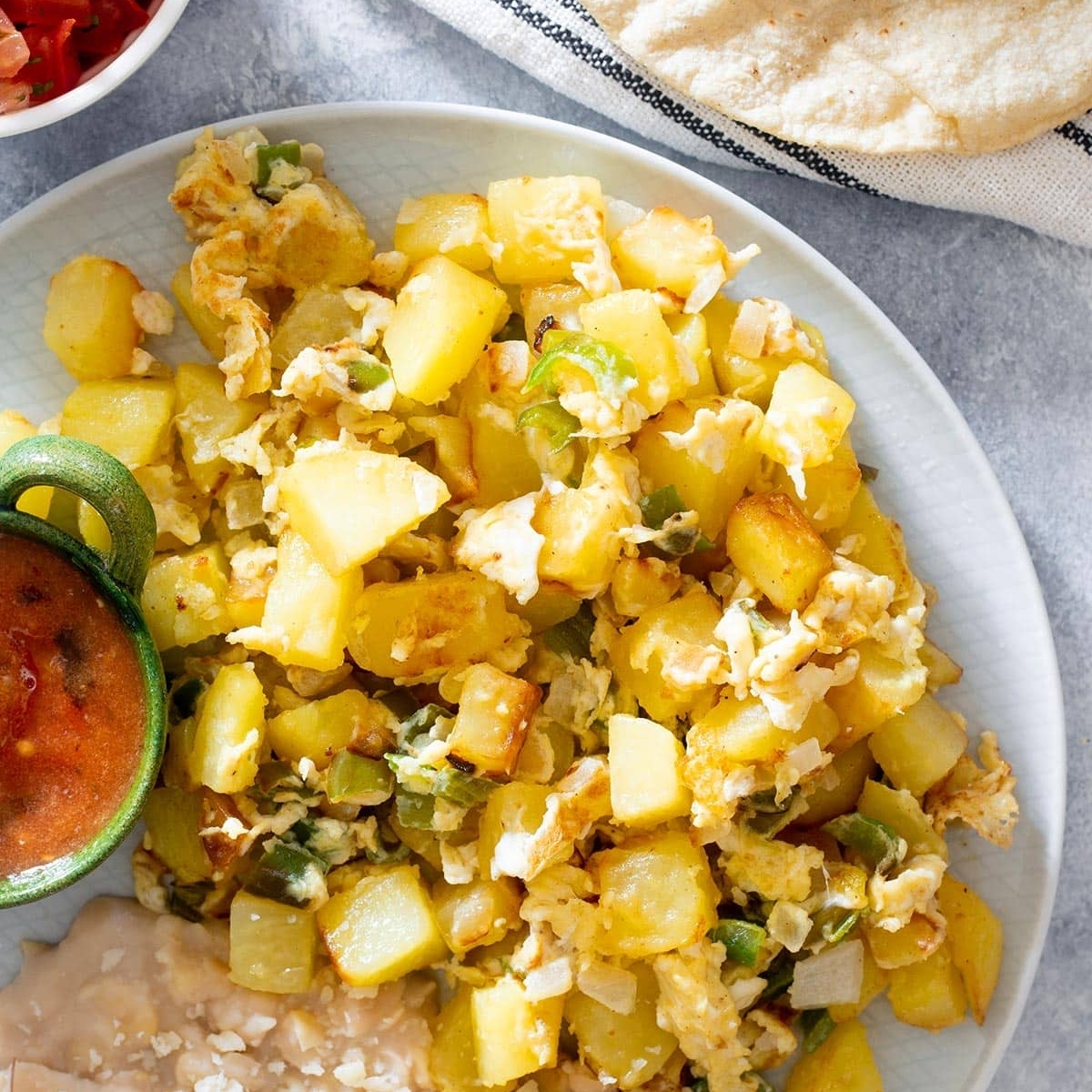Huevo con papas frijoles salsa y tortillas