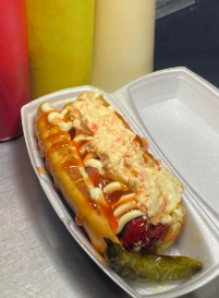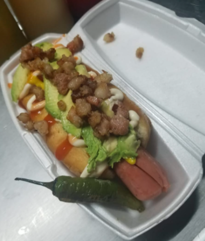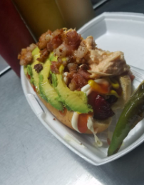 Salchicha jumbo, tocino y aguacate, tomate, cebolla, mayonesa, mostaza y cátsup.