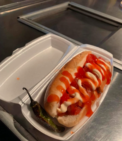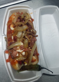Lleva salchicha normal con jamón, tomate, cebolla, mayonesa, mostaza y cátsup.