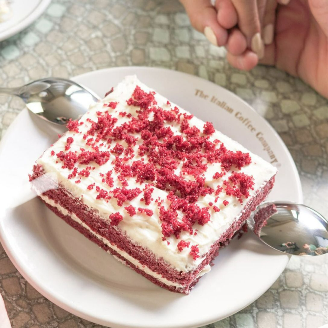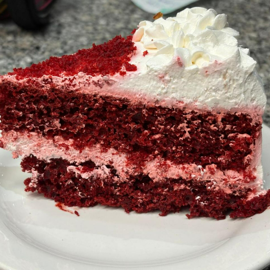 Pastel rojo con suave sabor a cacao, relleno y cubierto con betún de queso crema.
