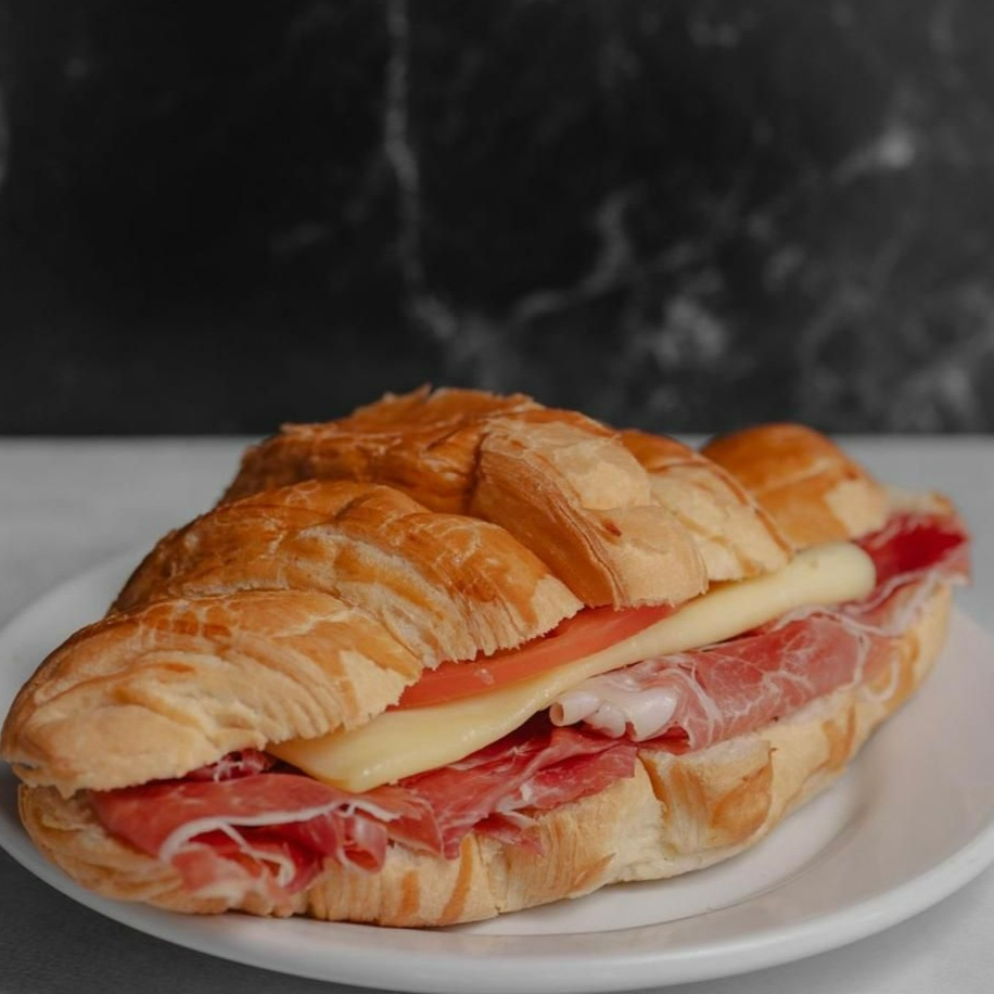 Cuernito con jamón serrano, queso gouda, jitomate y aderezos de la casa.