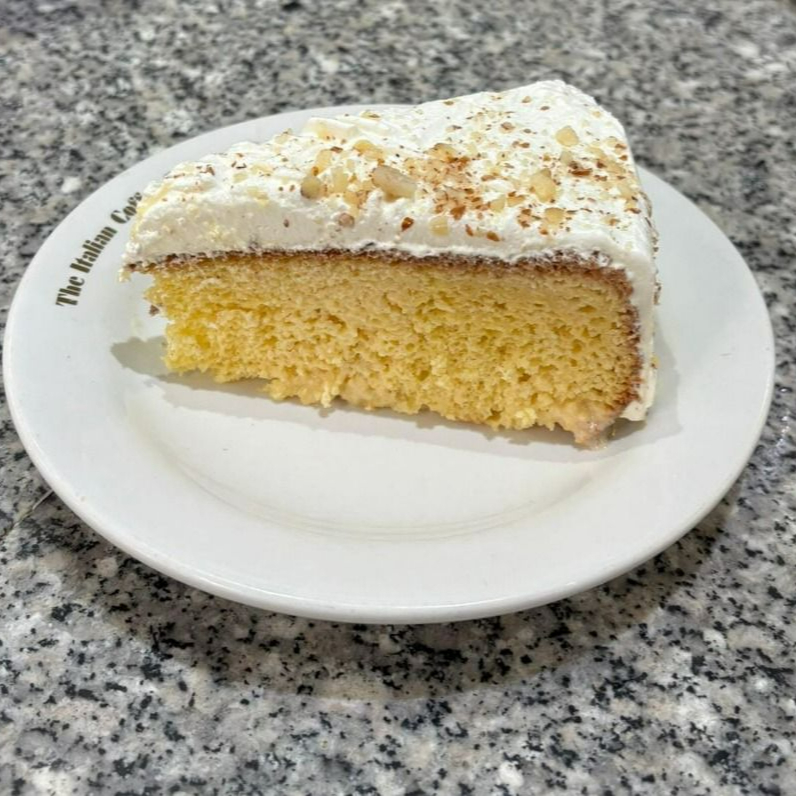 Bizcocho esponjoso bañado en mezcla de tres leches, cubierto con chantilly.