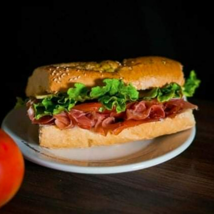 Panino de jamón de pierna, salami, queso gouda, lechuga y aderezos de la casa.