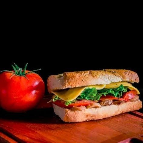 Panino de champiñones, queso gouda, lechuga, jitomate, aderezo de espinaca y aderezos de la casa.