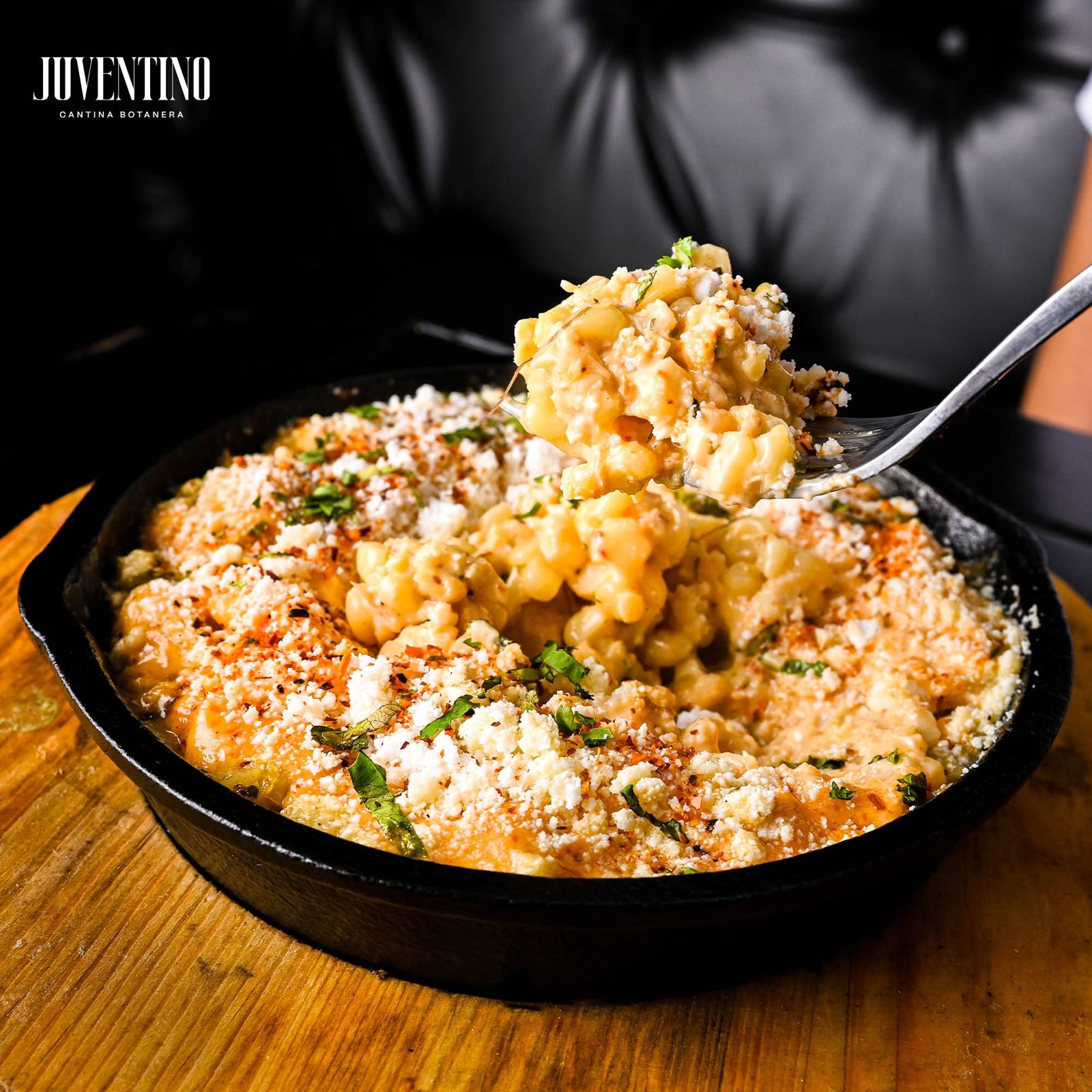 Esquite sofrito en mantequilla, chile de árbol, queso de canasta y aderezo de tajin.