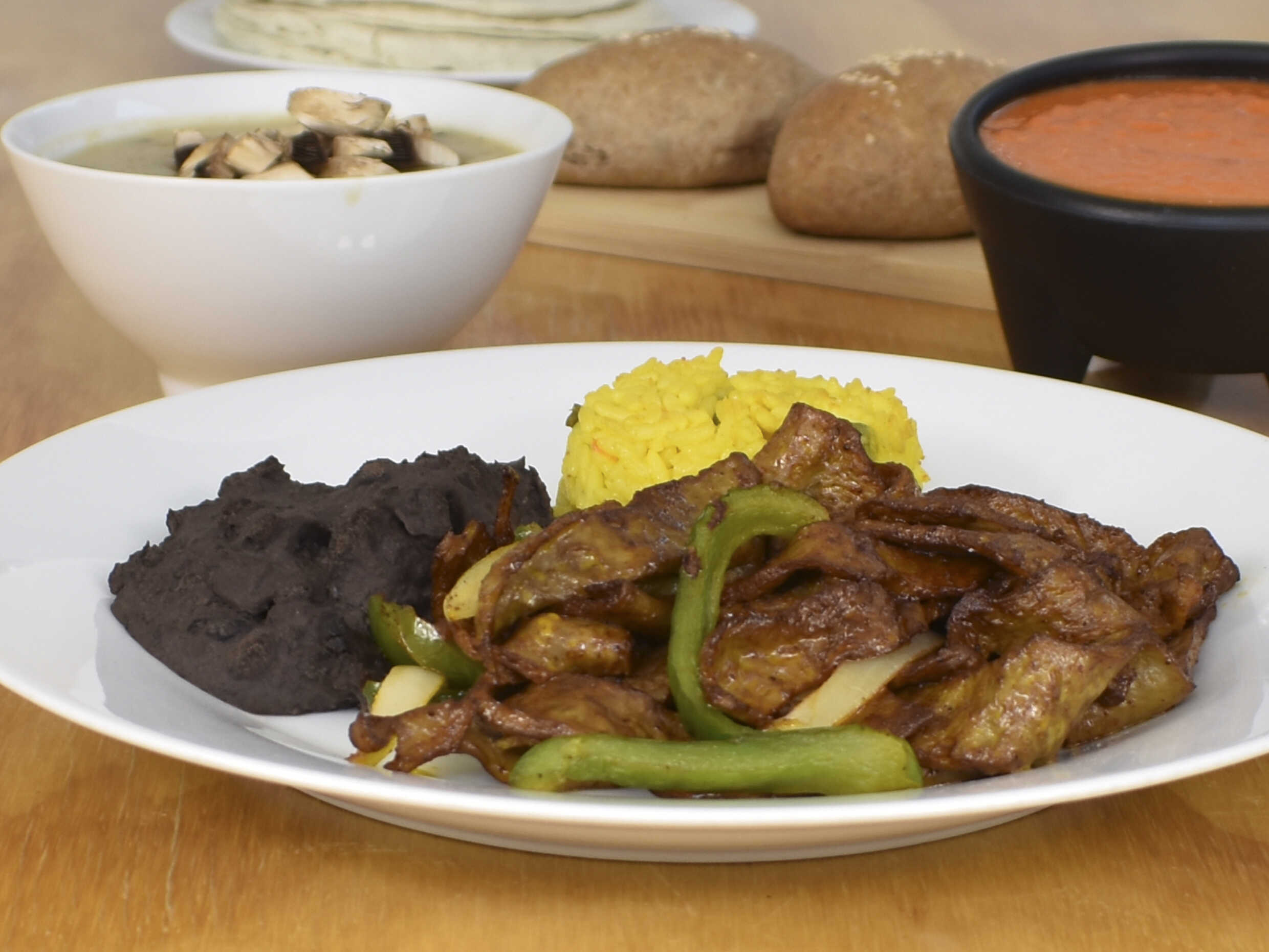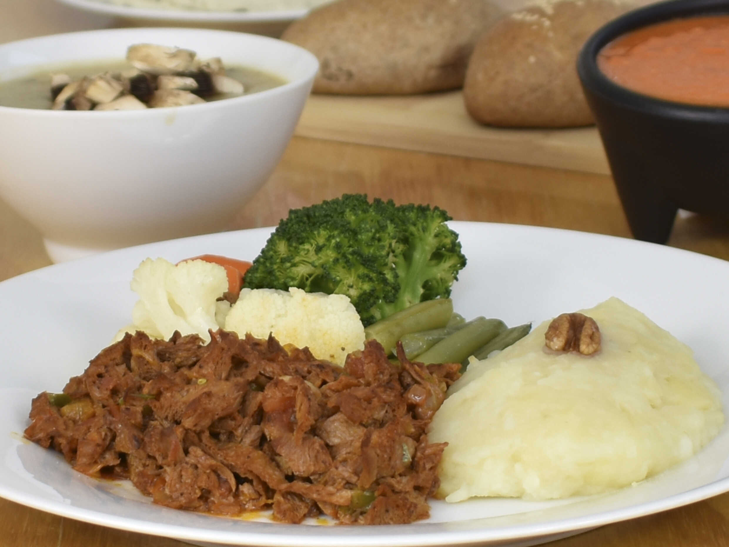 Deshebrada Vegana con Verduras cocidas, puré de papa, ensalada, tortillas, salsa y aderezo.