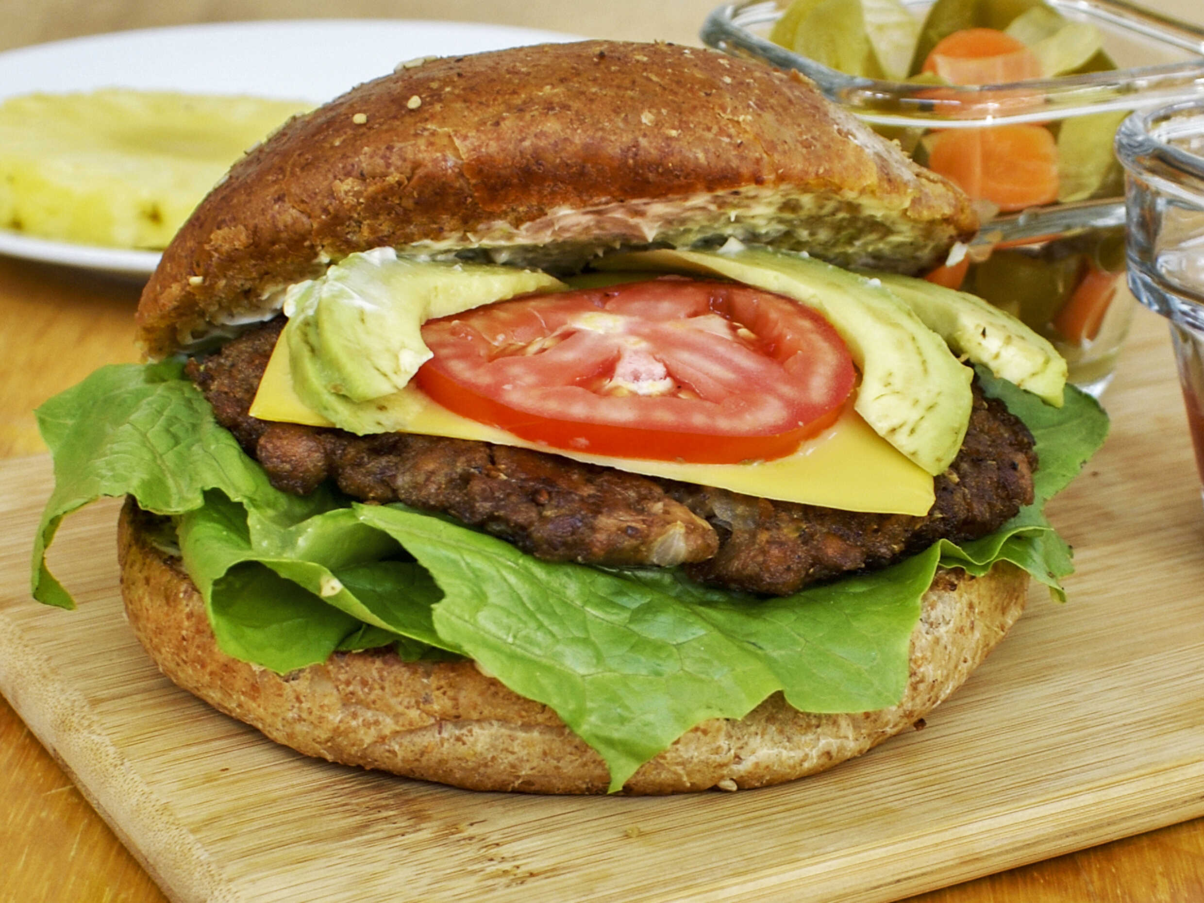 Queso amarillo normal, lechuga, tomate, carne vegana.