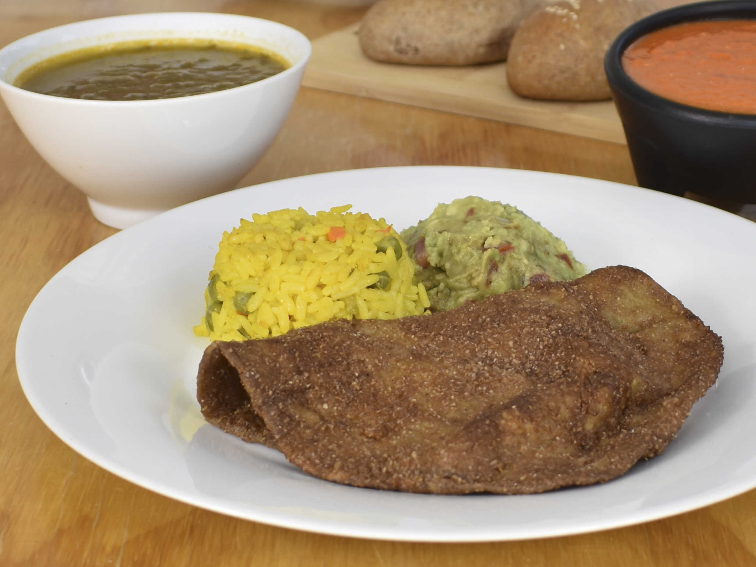 Acompañado con arroz,guacamole, tortillas, aderezo, salsa ,incluye sopa o crema del día y agua