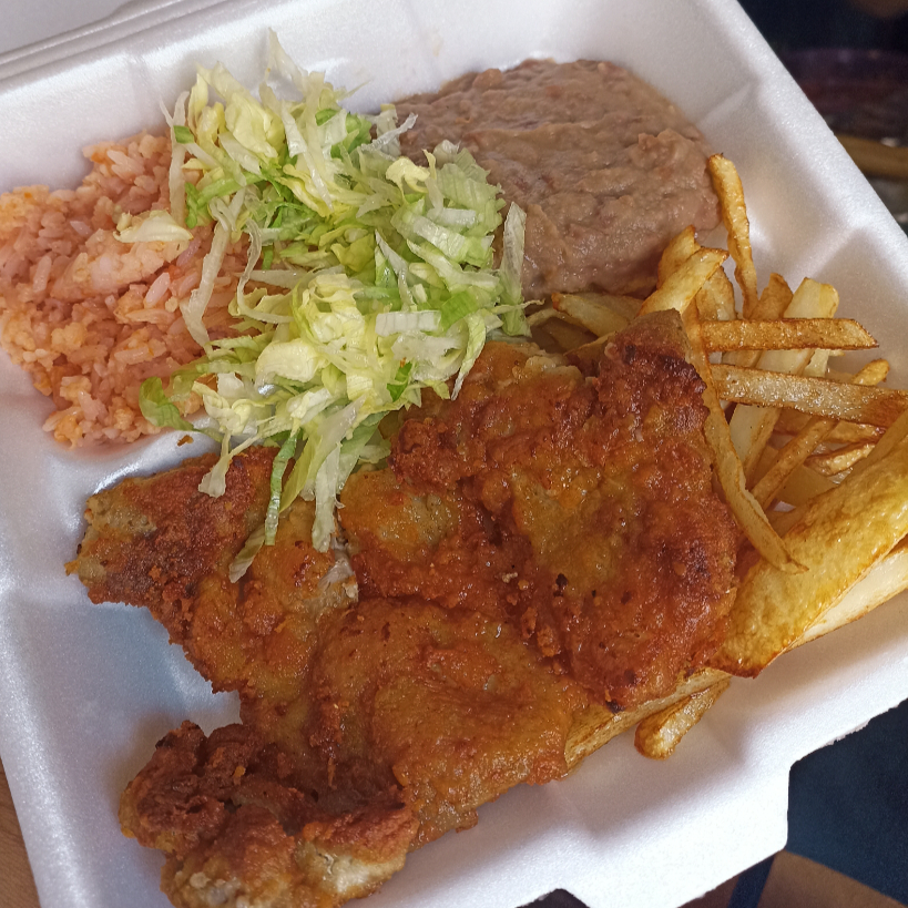 acompañado de papas fritas, arroz y frijoles