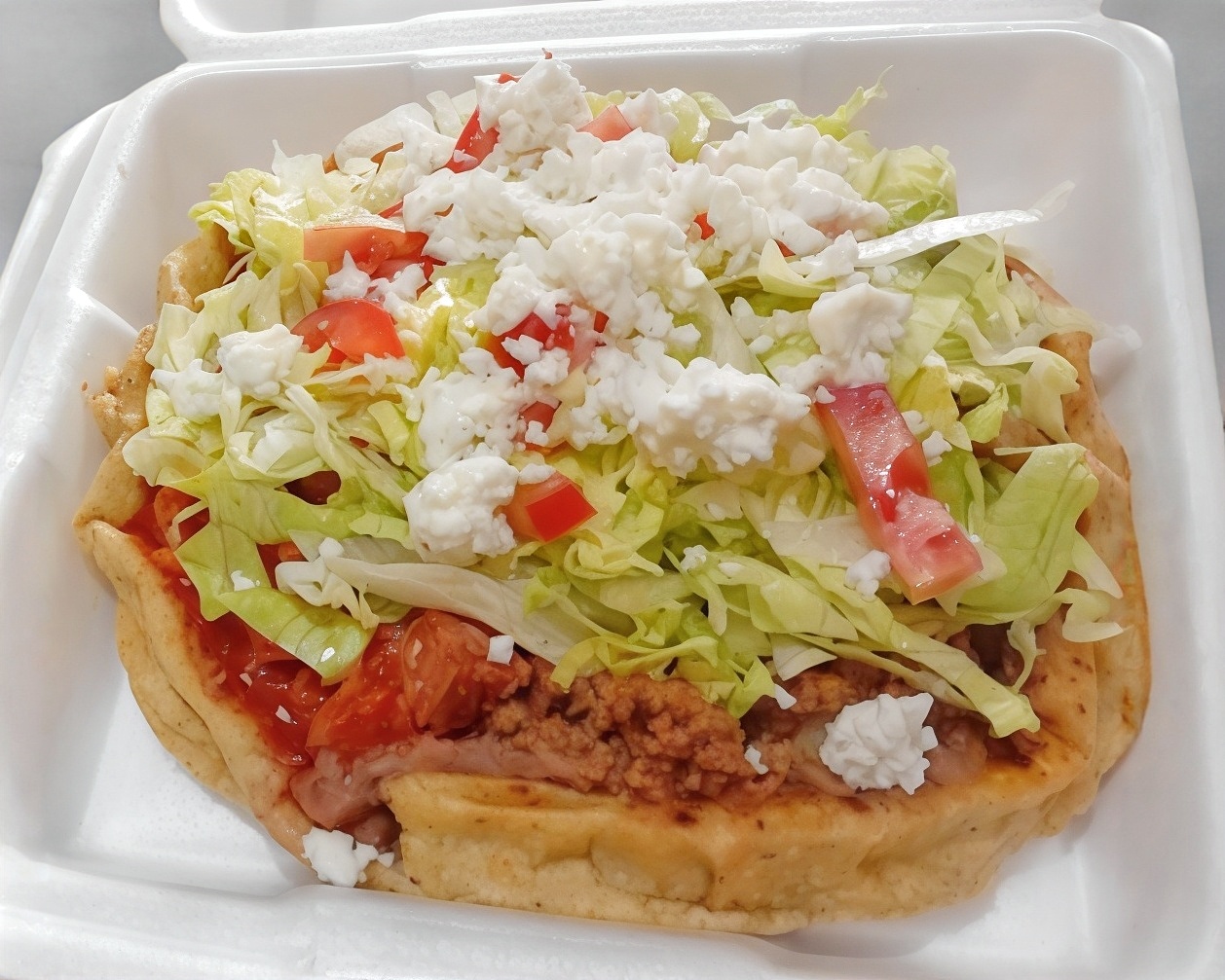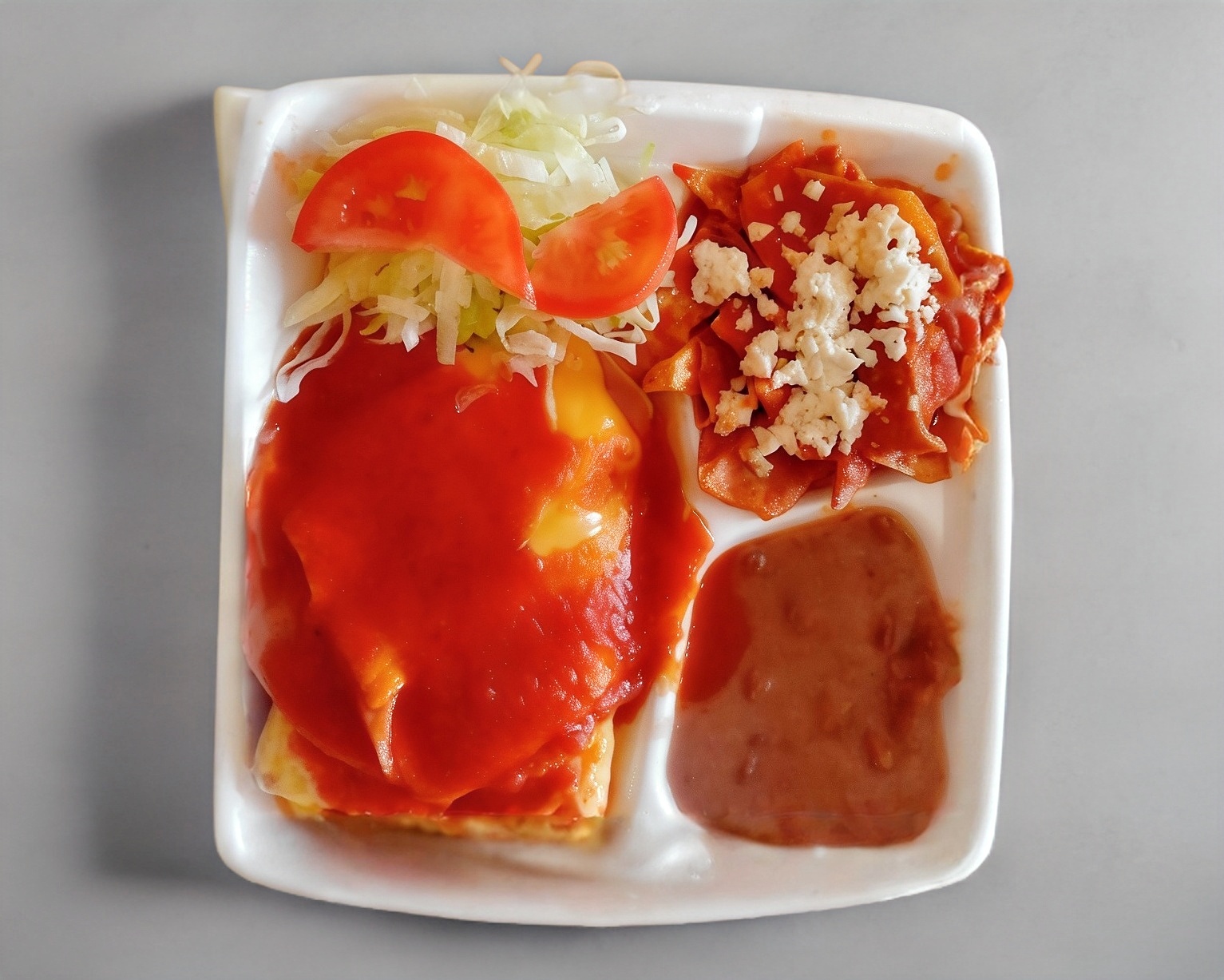 Relleno de frijoles, acompañado de chilaquiles y frijoles.