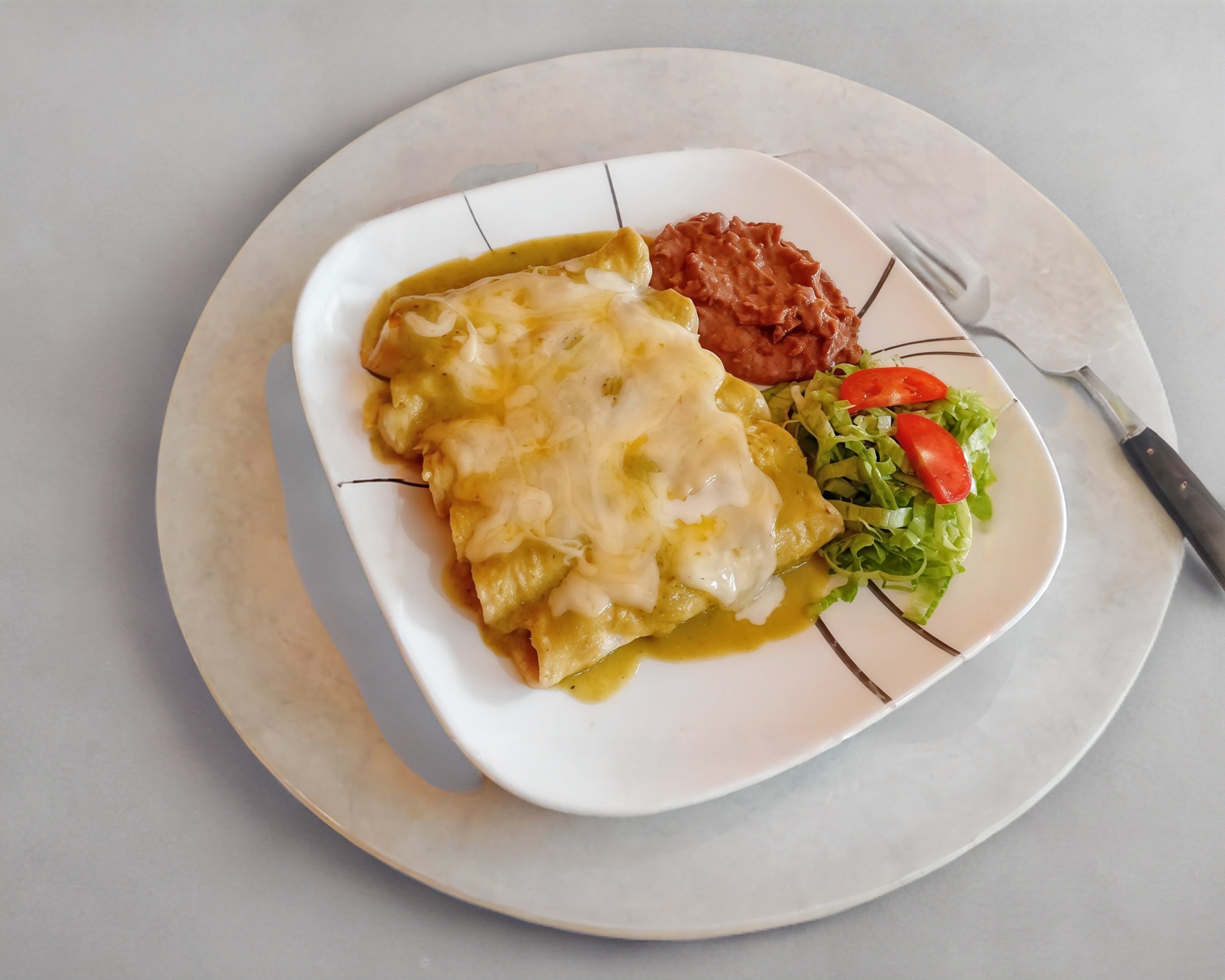Entomatadas rellenas de queso acompañadas de frijoles y queso