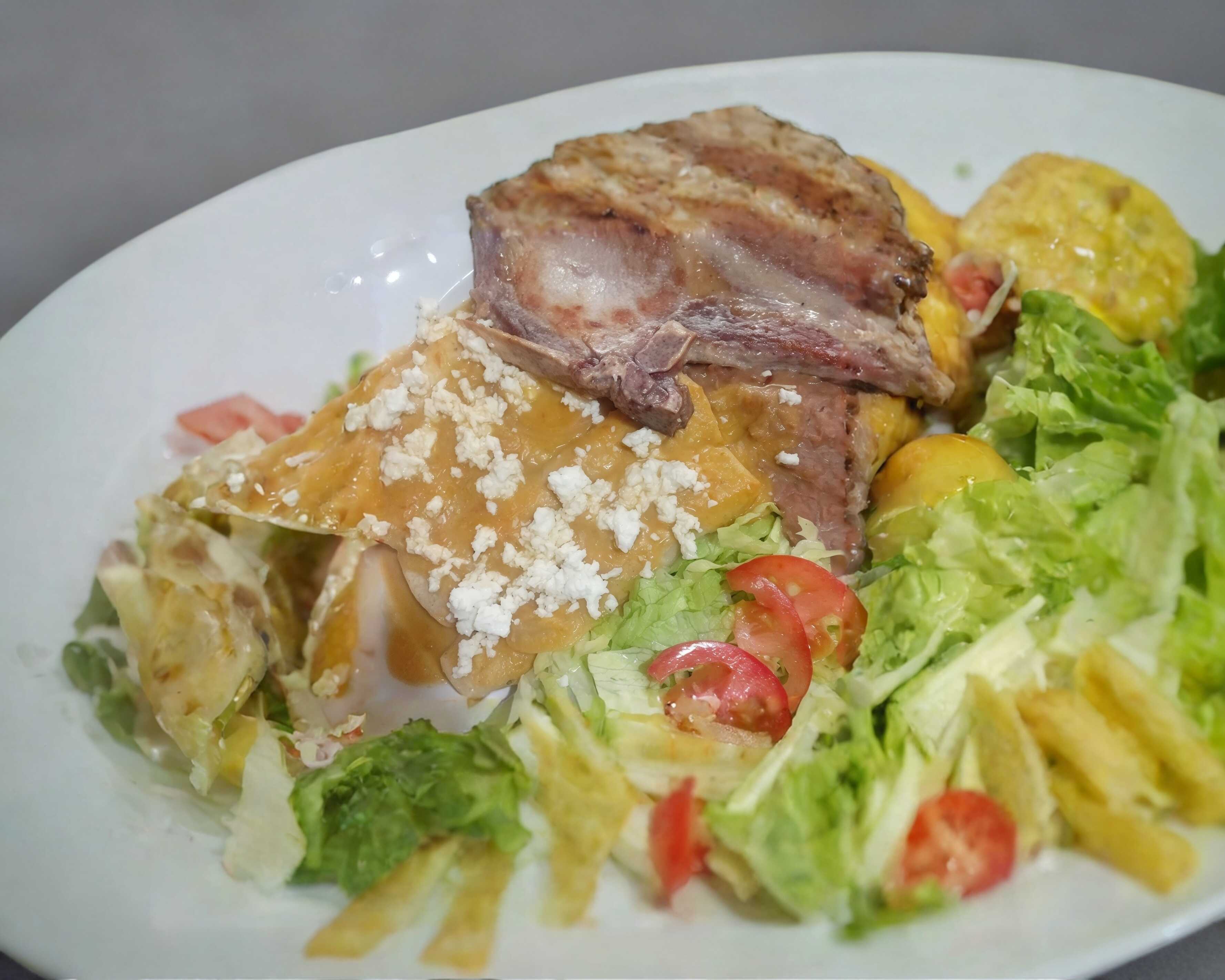 Con queso adentro, acompañadas con ensalada y chuleta a la plancha