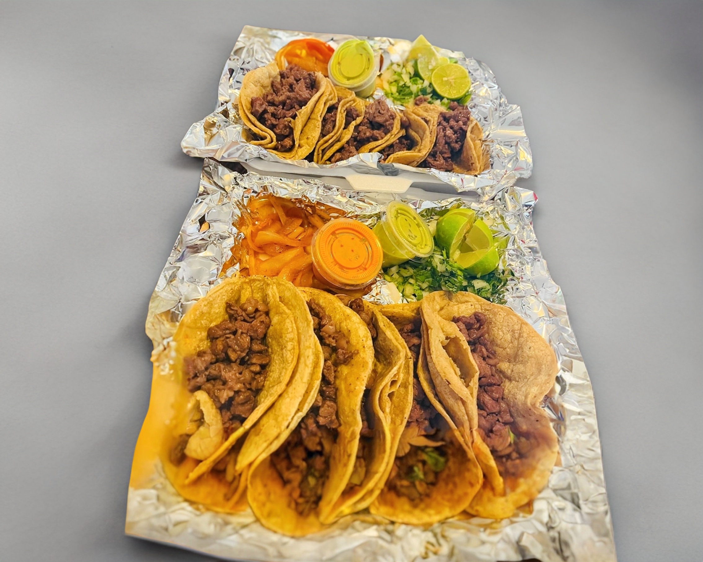 Orden de 5 tacos de bisteck con tortilla doble, acompañadas de sus salsas, cilantro y cebolla asada