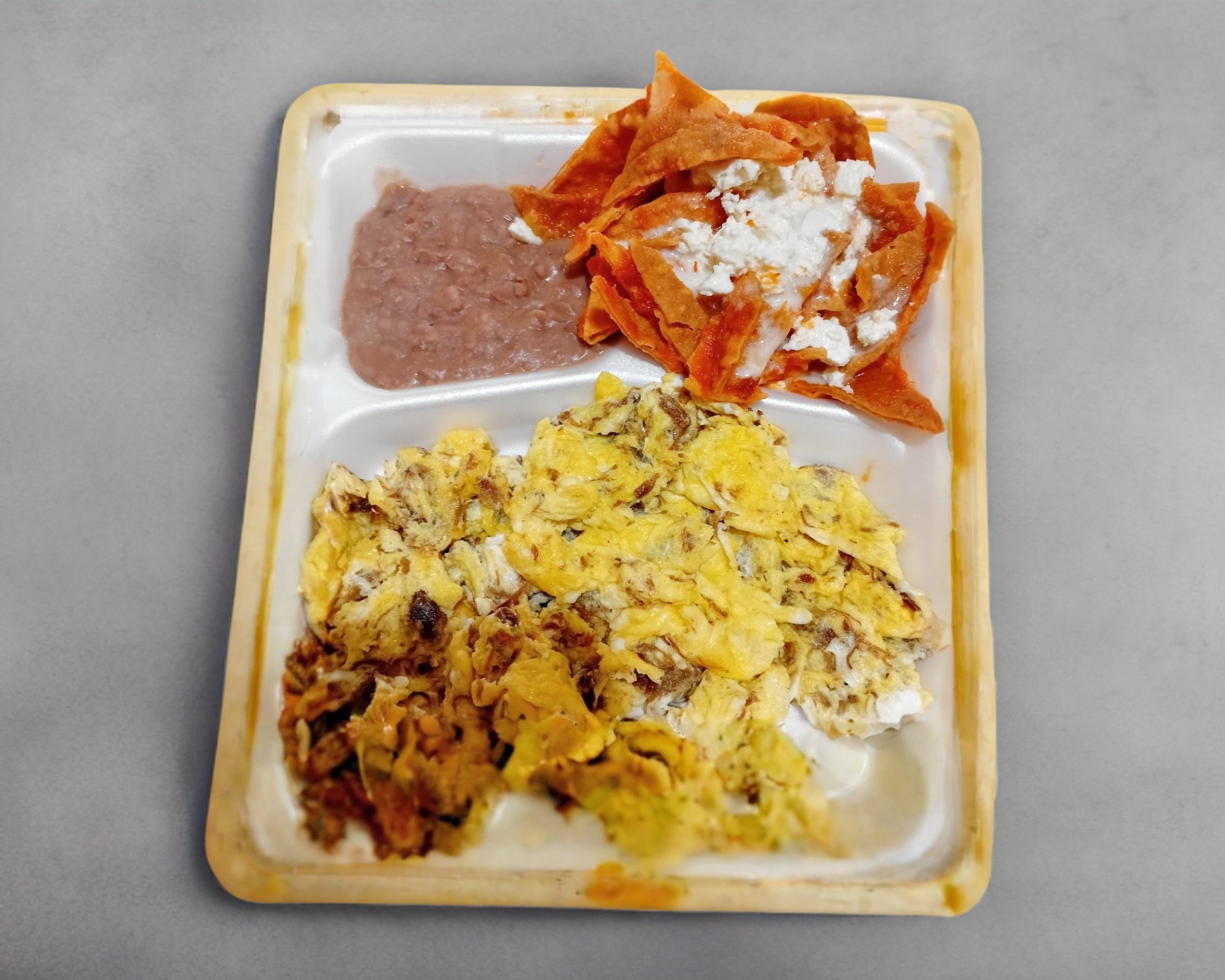 Huevo con machacado, acompañado de chilaquiles y frijoles