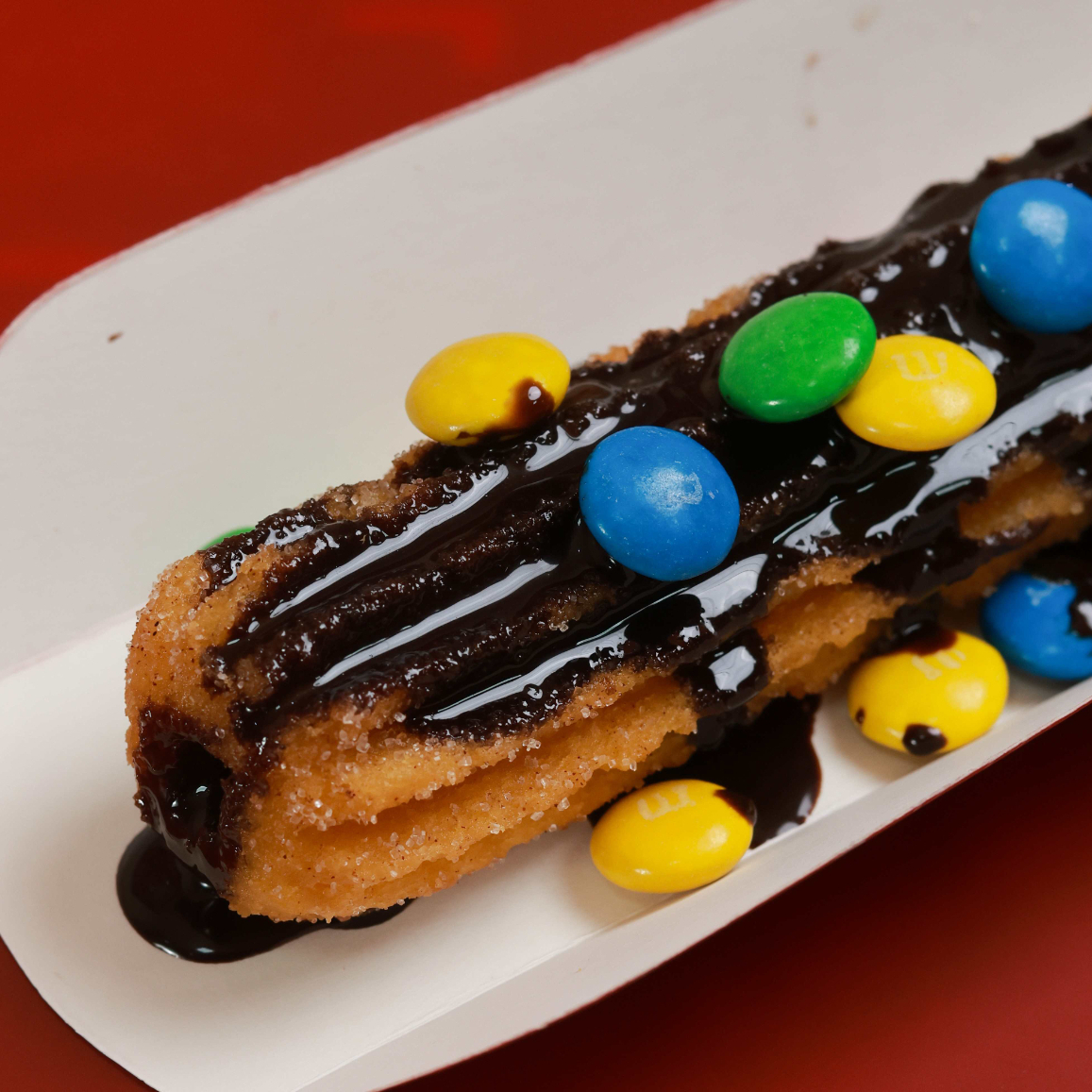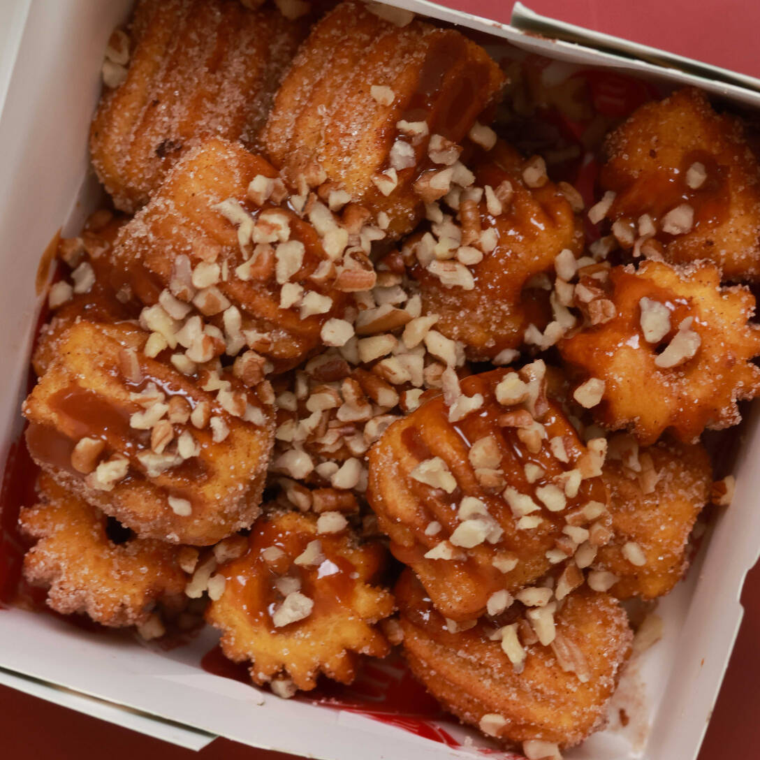 12 Churro bites en caja 1 sabor de relleno a elegir, 1 topping a elegir.