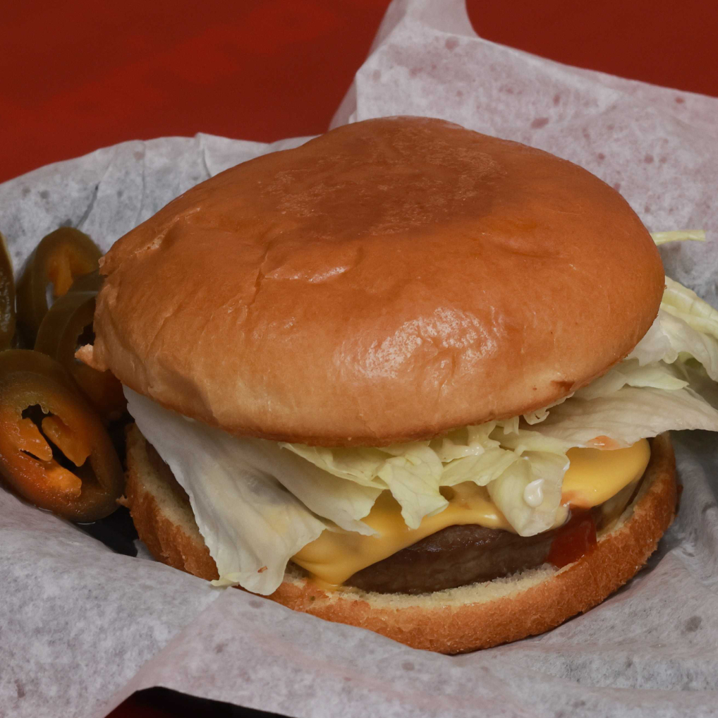 Hamburguesa de Sirloin, con mostaza, mayonesa, catsup, lechuga, tomate y jalapeños