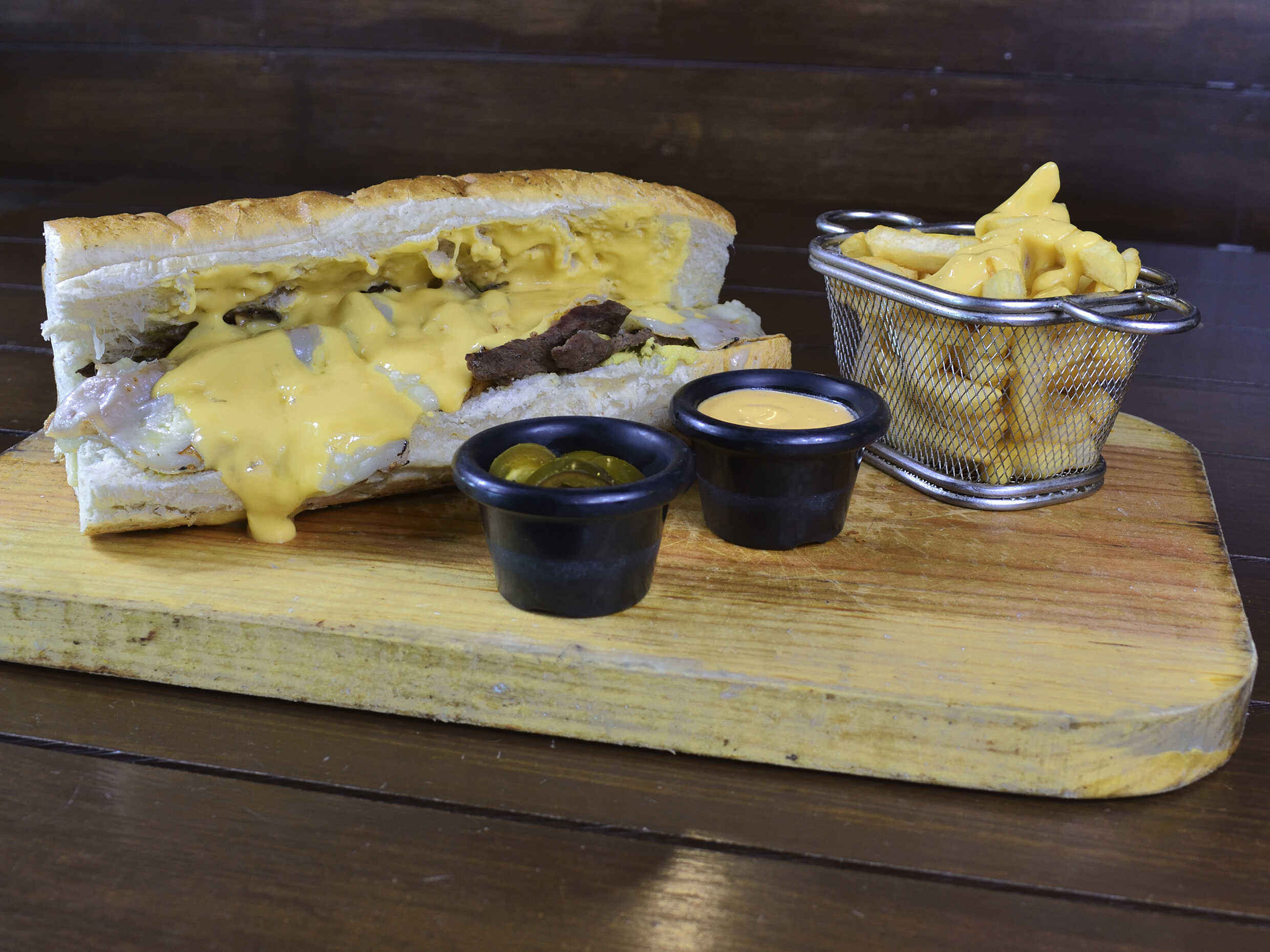 CARNE DE SIRLON, ADEREZOS, LECHUGA, TOMATE, PEPINILLOS, QUESO MOZZARELLA BAÑADA DE QUESO CHEDDAR Y TROZOS DE TOCINO PAPAS FRITAS Y JALAPEÑOS