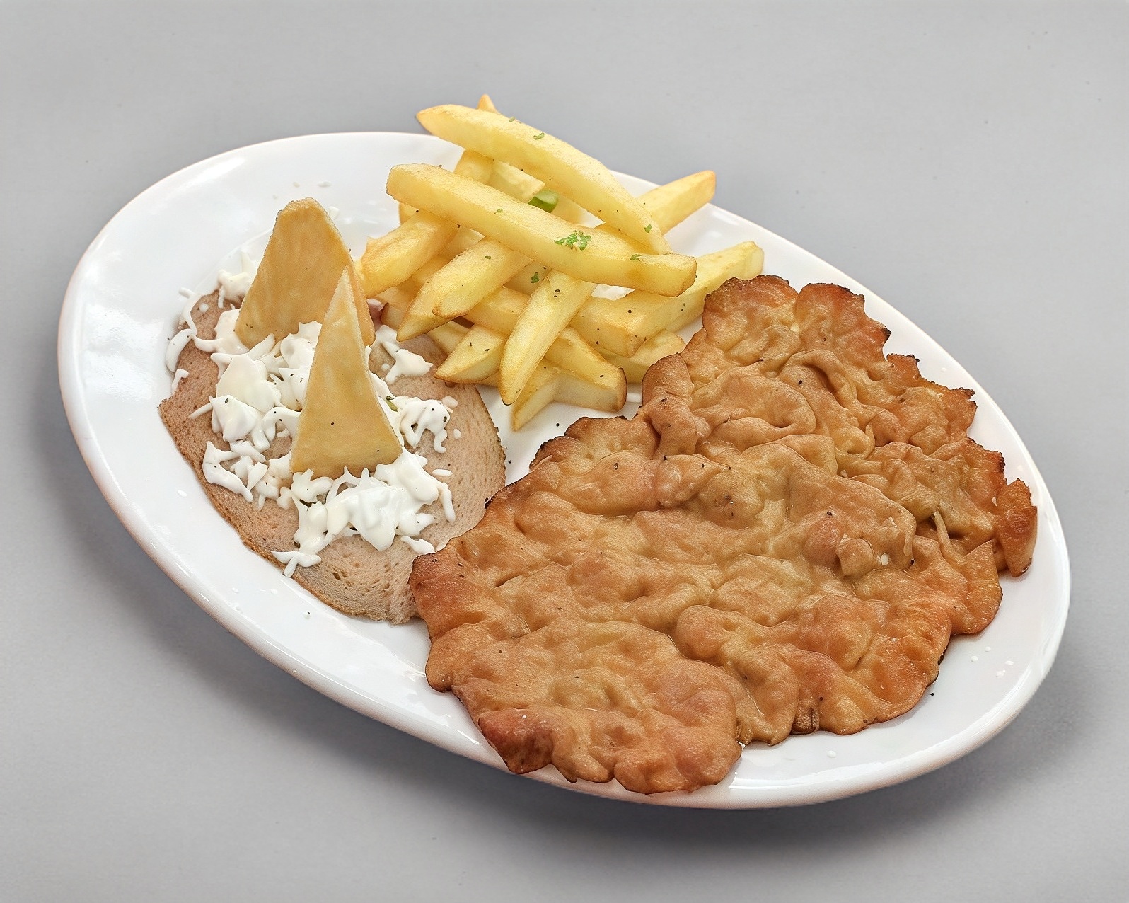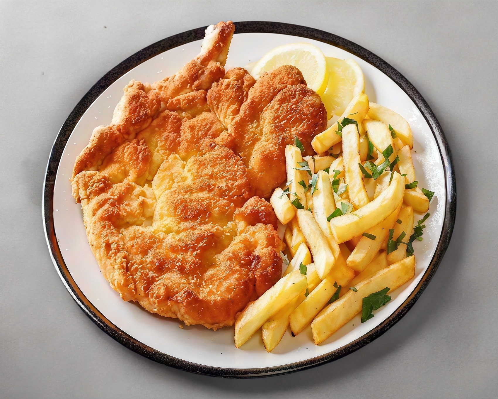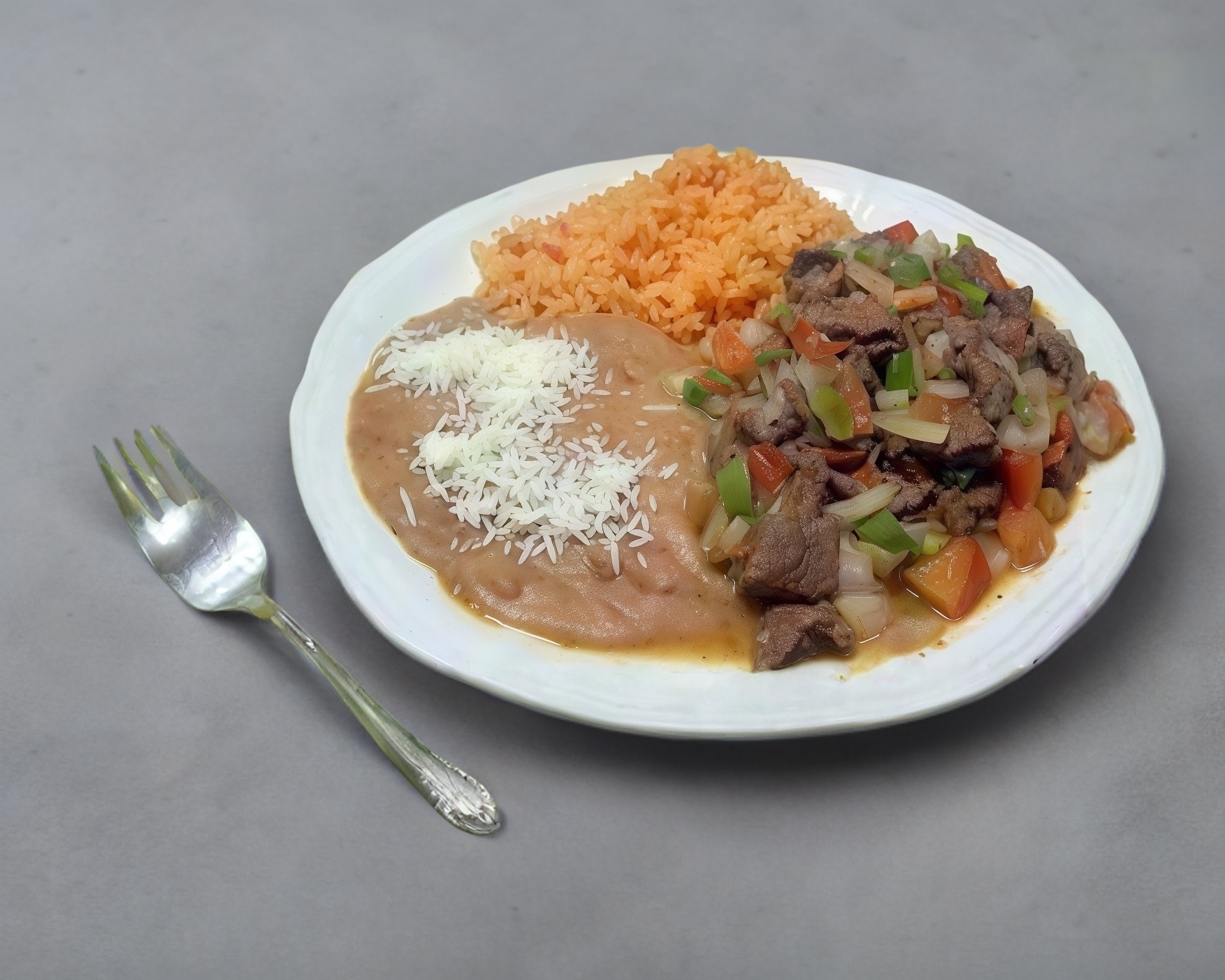 carne empanizada, papas fritas frijoles, salsa