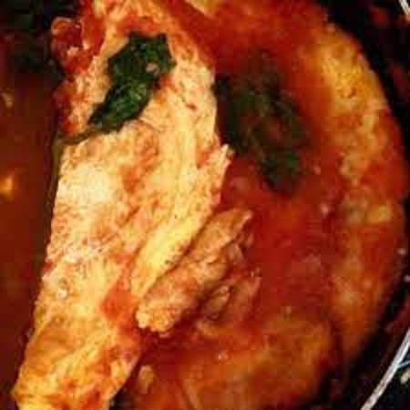 torta de huevo jamon queso amarillo bañado en salsa tomate chile cebolla, tostitos, guanciones