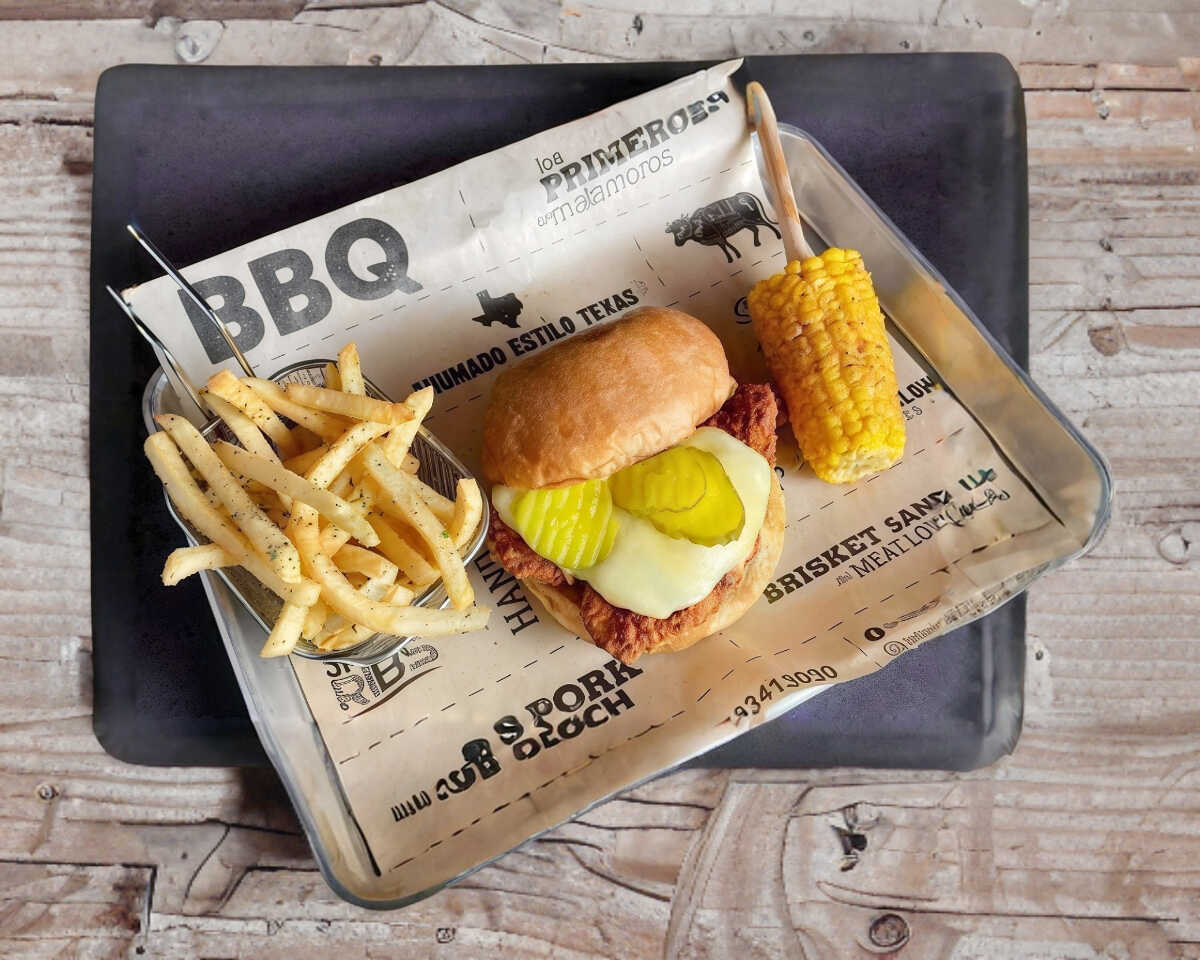 Sándwich de pollo empanizado, queso gratinado, salsa BBQ, mayonesa de la casa, papas a la francesa, elote amarillo aderezo de chipotle, jalapeños y pepinillos.